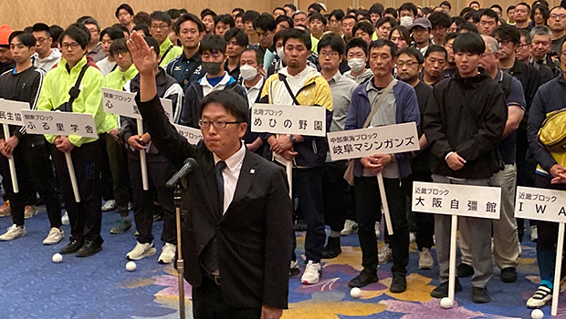 優勝旗返還の後、みなと寮主将、中谷厚さんが「種別を超えた現場のつながりこそ、地域共生社会への第一歩。チーム同士が交流を深められるよう、楽しく一生懸命プレーすることを誓います」と宣誓した。