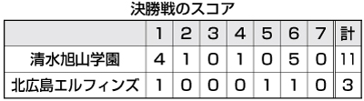 北広島は五回裏、8番・吉田が本塁打で2点目を上げた。しかし、清水旭山は六回表に7番・鈴木の2塁打を起点に、打者一巡の猛攻で一挙に5点を加えて11点とした。