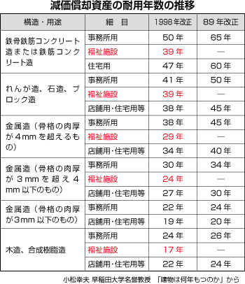 建物の寿命という話題に必ず出てくるのが耐用年数である=表。耐用年数を過ぎたから、そろそろ建て替えを検討しなければ、といった話である。結論を言うと、建物の寿命を使用可能年数と考えた時、耐用年数は建物の寿命にまったく関係がない。耐用年数は、財務省が示す法定耐用年数のことで、法人税額の算出に使われる経理上の減価償却期間である。