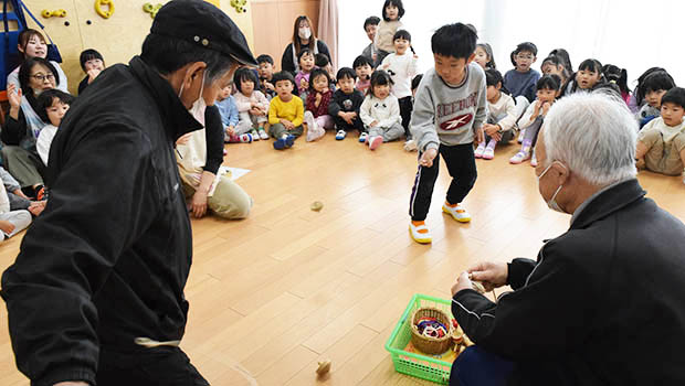 続いて園児がこま回し、拳玉、あやとりなどを披露すると、高齢者も童心に戻って参加。こまにうまくひもを巻けない高齢者を園児が助けたり、「がんばれ~」と応援したりして、盛り上がった。