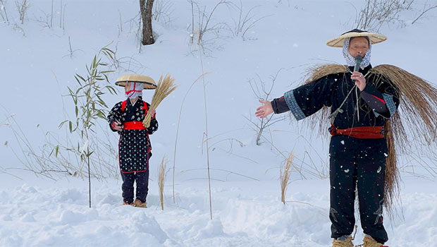 イベントのオープニングでは初めて、胆沢地域で伝統的に伝わる「庭田植え」が披露された。これは小正月の1月中旬に、秋の豊作を祈願して各家庭で行われてきた儀式。田植え歌が響く中、昔ながらのみのやわらぐつを身につけた人が、田んぼに見立てた雪に稲を植える姿を参加者は温かく見守った。