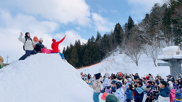 催しは、地域公益プロジェクトの一環として、2023年から地元企業とともに閉鎖したスキー場で開始。今回は、こどもをそりに乗せて親が引っ張るそり引きレースや、宝探し、餅まきなど多くのアトラクションが繰り広げられた。