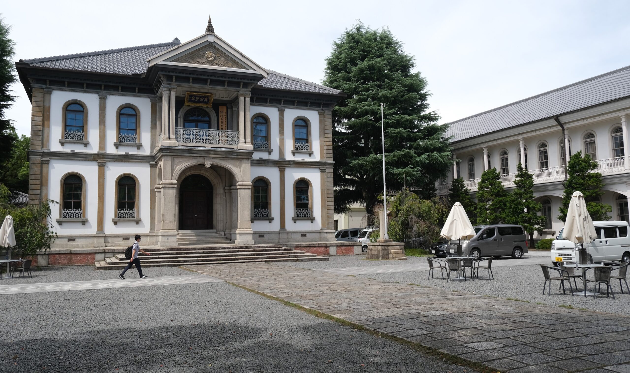 「学寮」の跡地には、明治時代に建てられた「大教校」の本館があった。2階建ての石柱の洋風建物だ。両側を取り囲むように、「大教校」の北黌(ほっこう)・南黌(なんこう)が建つ。国の重要文化財に指定され、今も大宮キャンパスの教室などとして使われている。