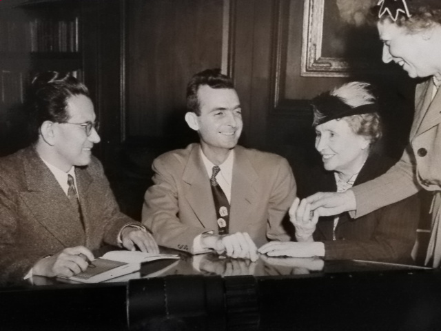 (左から)岩橋武夫、米国盲人援護協会常務理事のバーネット、ヘレン・ケラー(1950年1月12日、ニューヨークで撮影)=日本ライトハウス提供