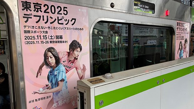 15~26日の12日間、東京都を中心に開催する聴覚障害者のためのスポーツの祭典「東京デフリンピック」が間近に迫る中、機運醸成を図るために東京都は都内JRの車両に広告を掲示している。