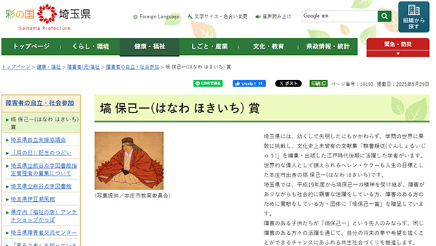 埼玉県は「第19回塙保己一賞」の受賞者を決定した。障害があり顕著な活躍をしている人や、障害者のために貢献している人・団体を表彰している。大賞には、国立民族学博物館(大阪府吹田市)の広瀬浩二郎人類基礎理論研究部教授が選ばれた。
