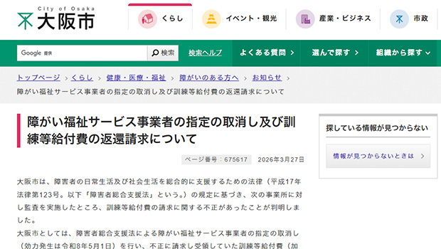 大阪市は3月27日、市内にある(株)絆ホールディングスグループの四つの就労継続支援A型事業所が、障害報酬の加算を不正に受給していたとして、5月1日付で事業者指定を取り消すと発表した。2024年4月から26年1月に不正に受け取った約79億円にペナルティーを上乗せした約110億円の返還を求めている。