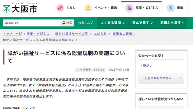 大阪市は3月31日、障害福祉サービスの就労継続支援B型事業所について、総量規制を実施すると発表した。市の第7期「障がい福祉計画」で見込む必要量を供給量が大幅に上回っているためで、新規開設と利用定員の追加を停止する。