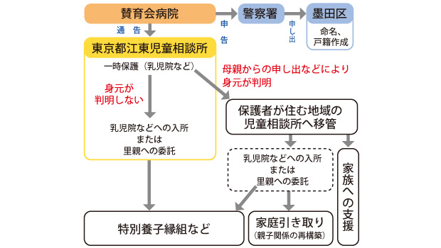 身元が分からなければ同児相が関わることになる。戸籍法上は棄児扱いとなり、墨田区が名前をつけ、新しく戸籍も作る。