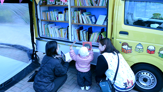 親子で好きな絵本を選び、移動図書館横に設けたテント内でいすに座って絵本を楽しむことができる。絵本選びに迷った際は保育教諭が年齢に合ったお薦めを紹介。絵本の貸し出し(約1カ月)もしており、翌月の移動図書館や施設に直接返却することが可能だ。