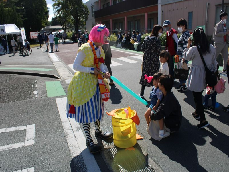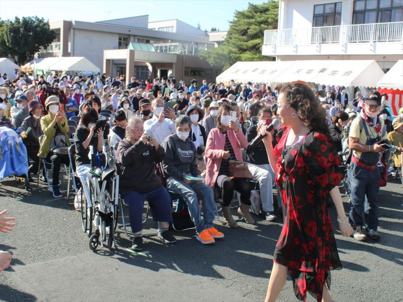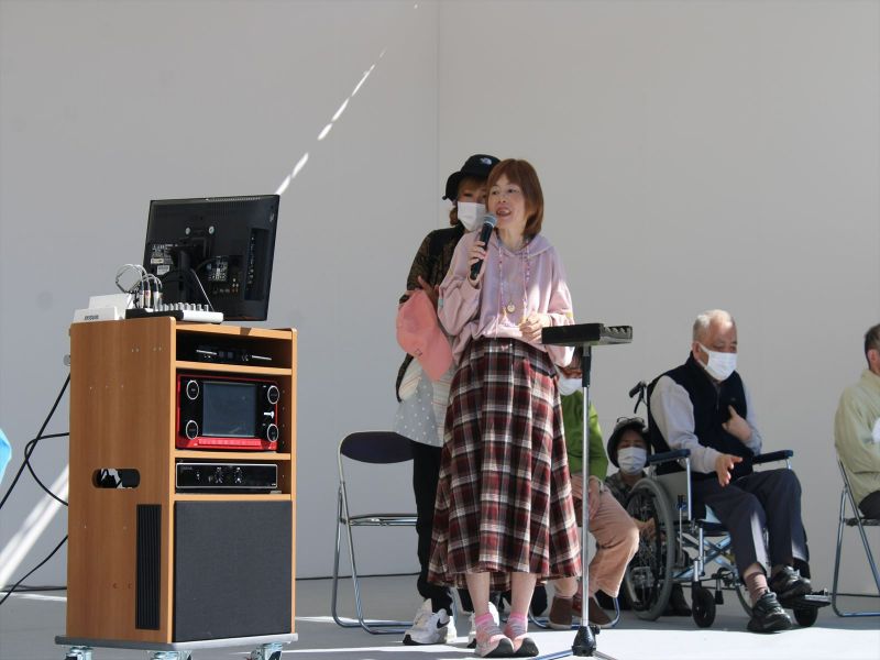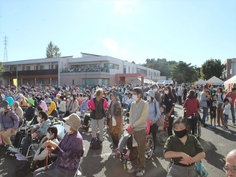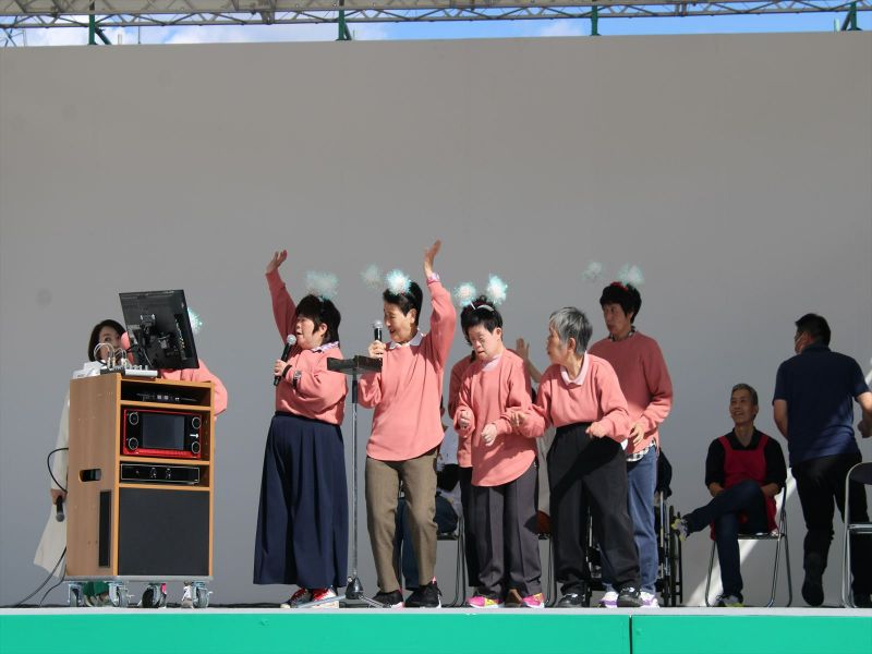 晴天の中、模擬店が立ち並び、ステージでは施設利用者によるカラオケ大会や地元中高生吹奏楽部の演奏、歌手あべ静江さんの歌謡ショーなどが繰り広げられ、利用者や訪れた地域住民は大いに盛り上がった。